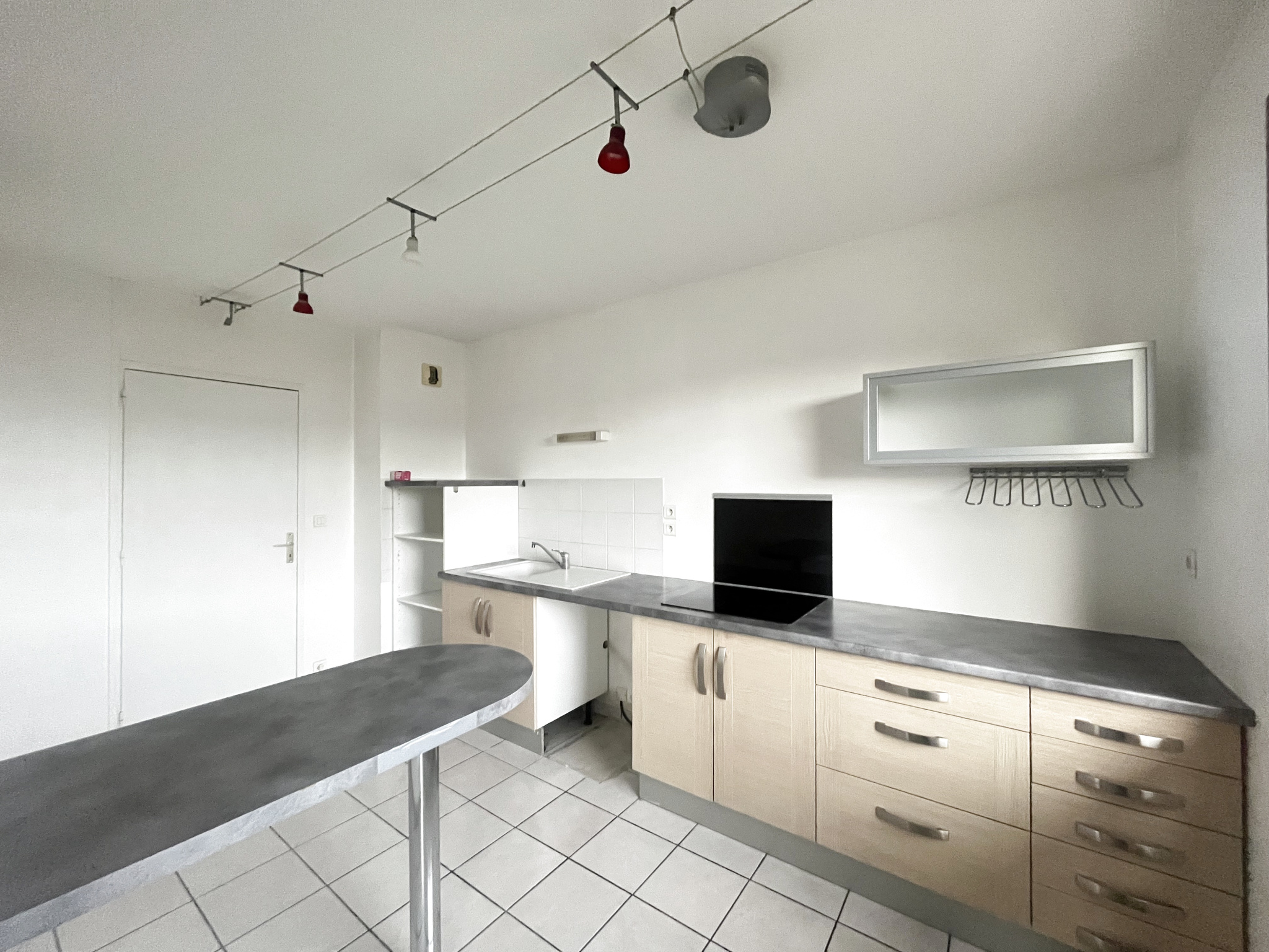 Pièce principale lumineuse avec coin cuisine équipée : meubles haut et bas, plan de travail, évier, plaques vitrocéramique, réfrigérateur, micro-ondes et hotte aspirante.