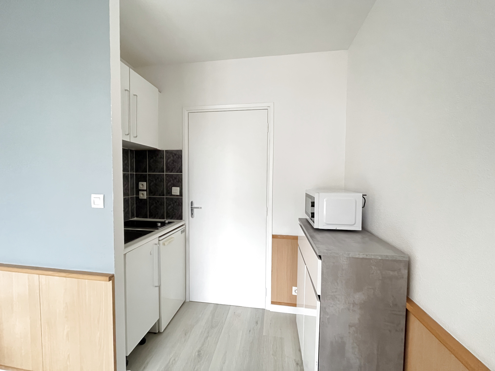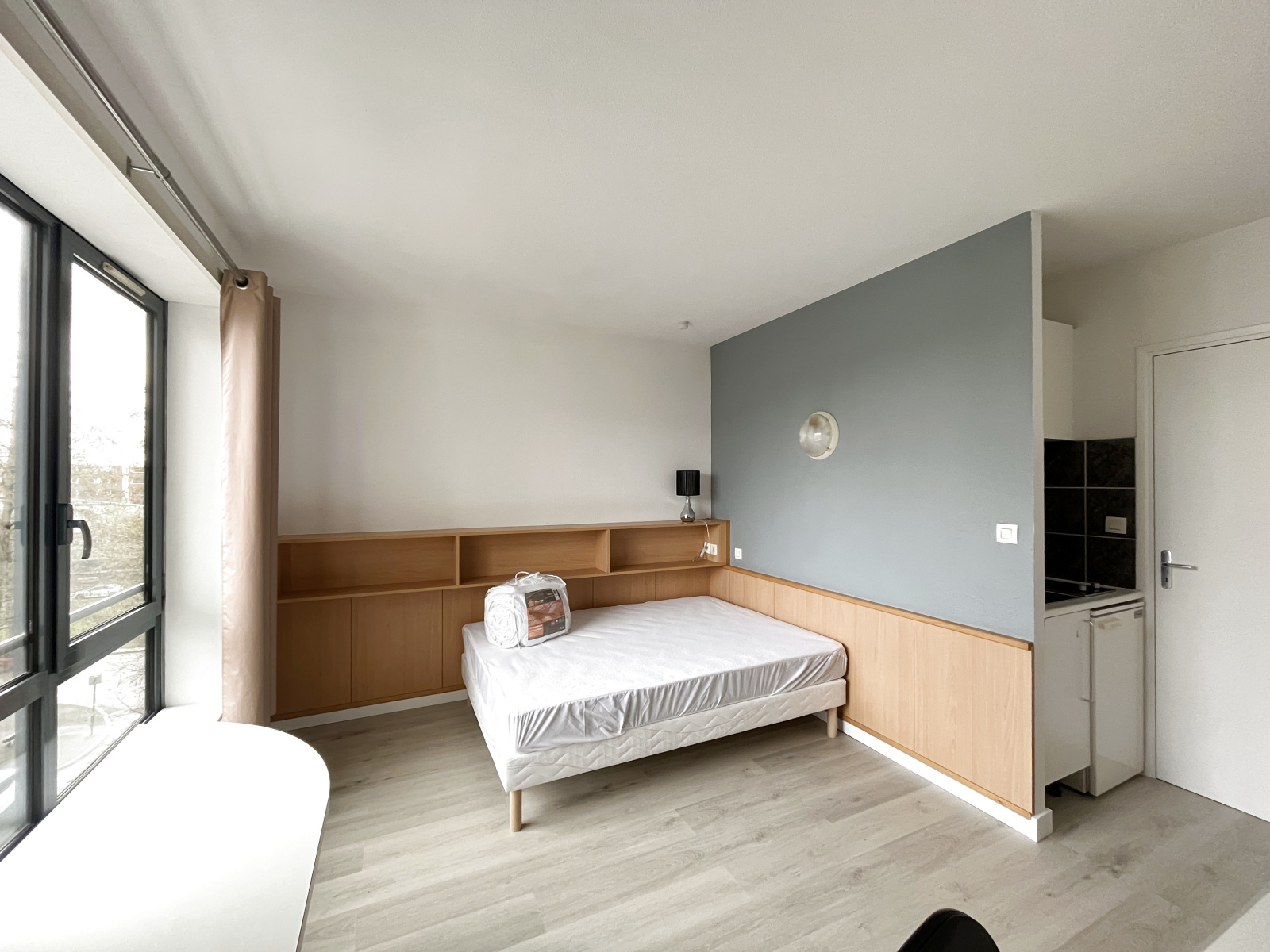 D'une pièce principale avec un bureau et une table escamotable, ouvert sur une cuisine kitchenette (frigo, plaques, placards).