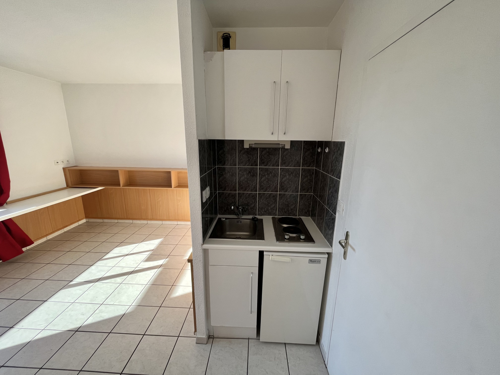 Celui-ci se compose d'une entrée avec placards de rangement, d'une grande pièce principale avec bureau, table escamotable et étagères, ouverte sur une cuisine kitchenette (frigo, plaques, placards). Il comprend également une salle de bain avec WC attenants.