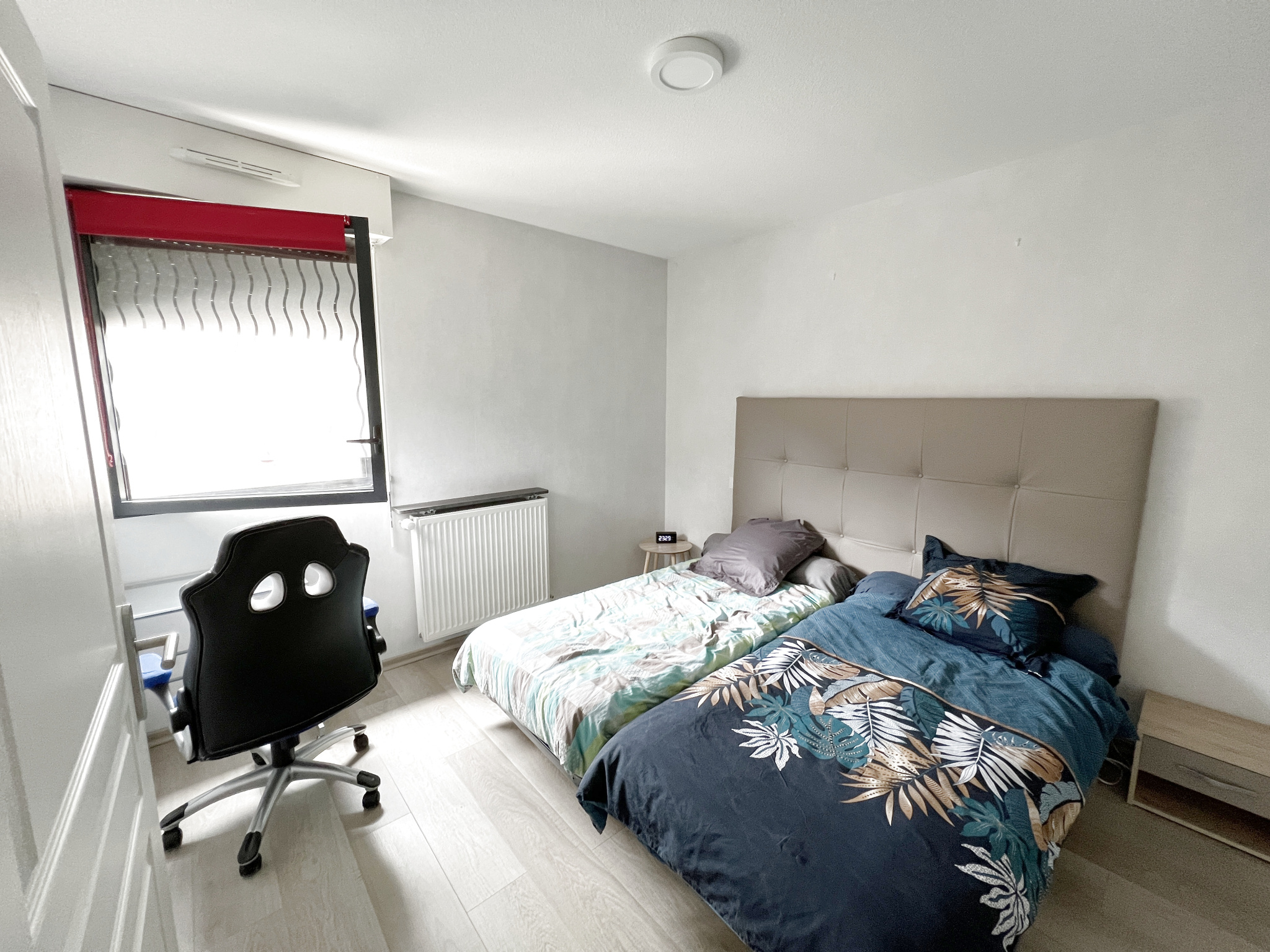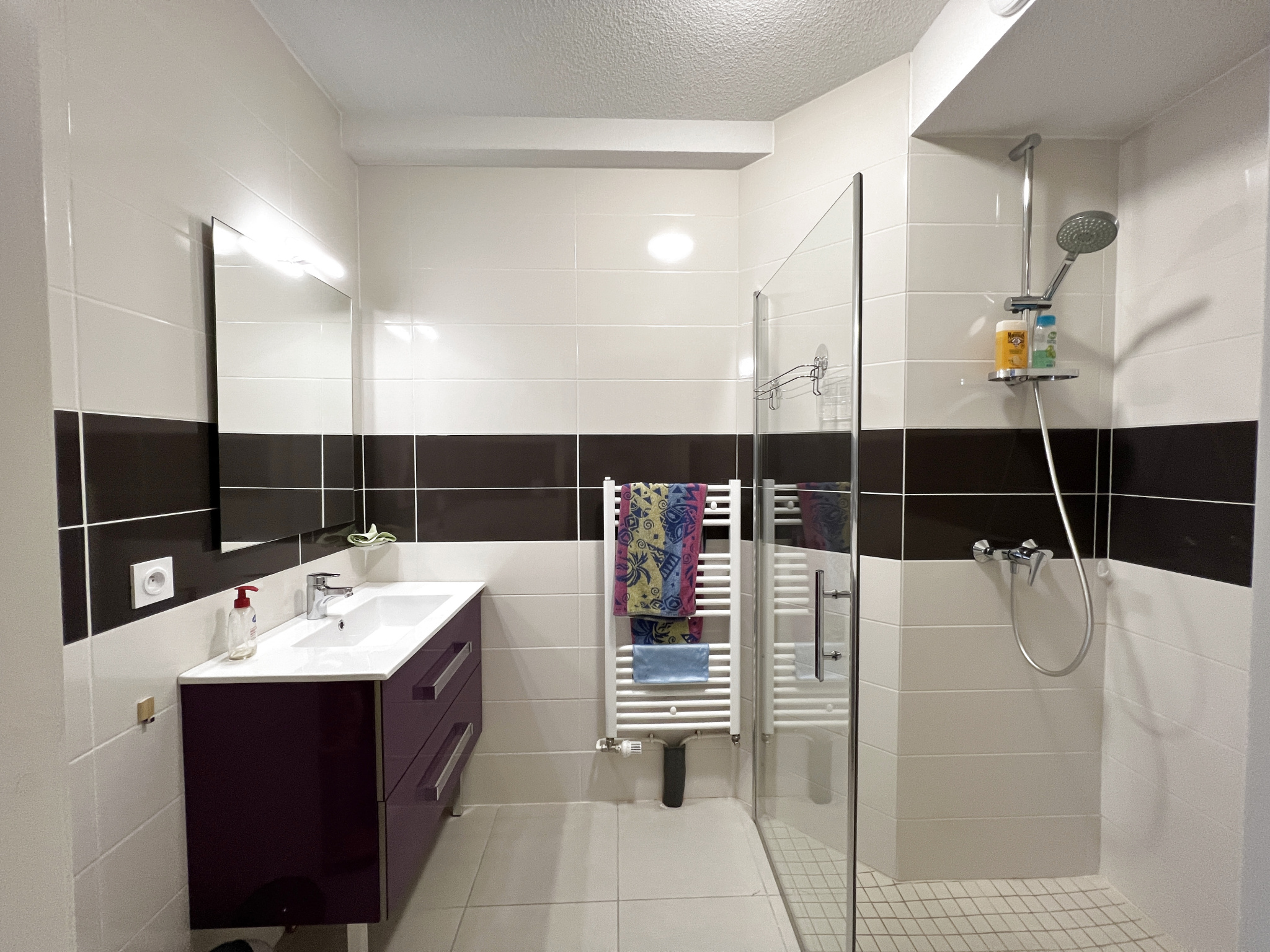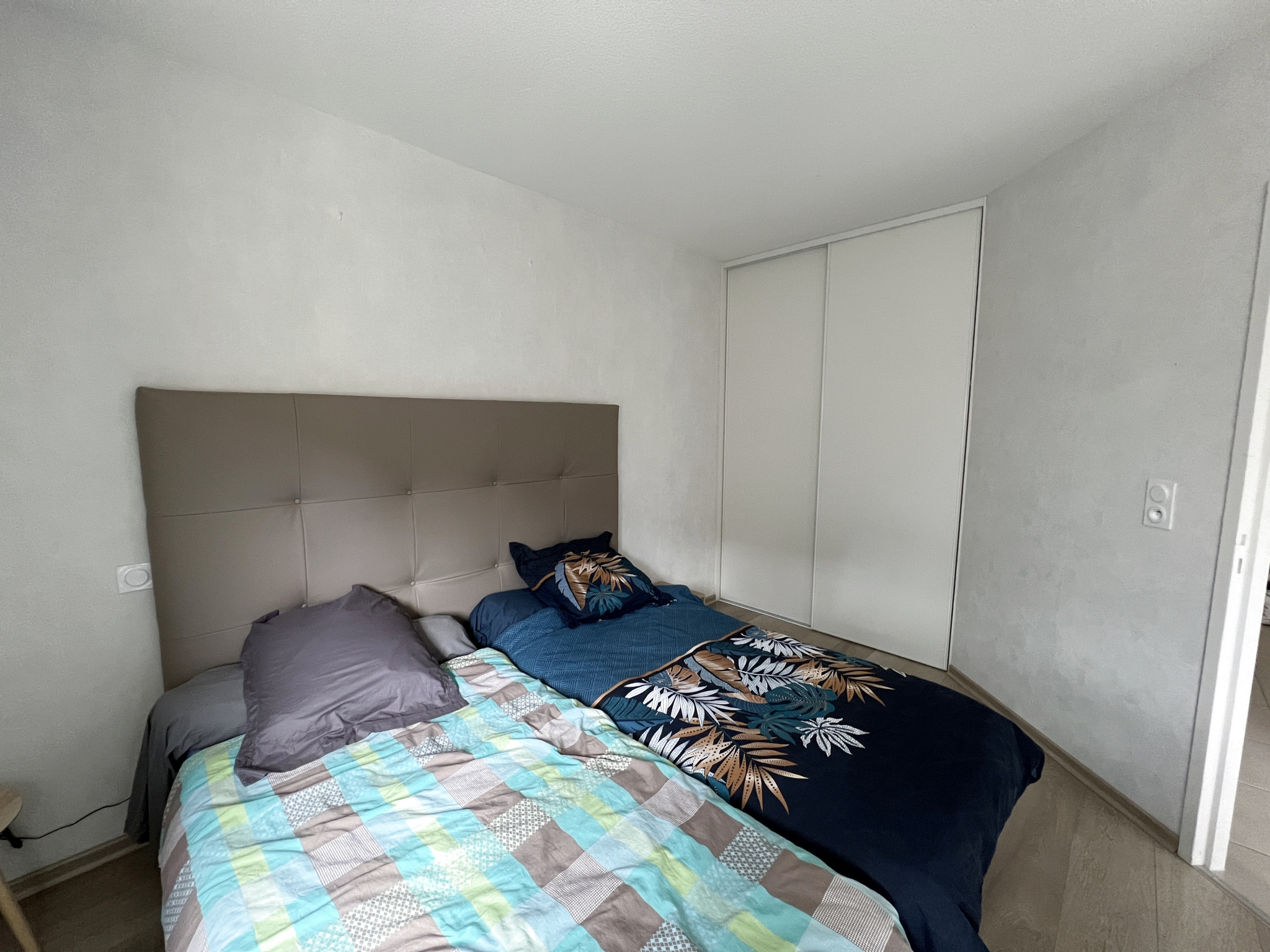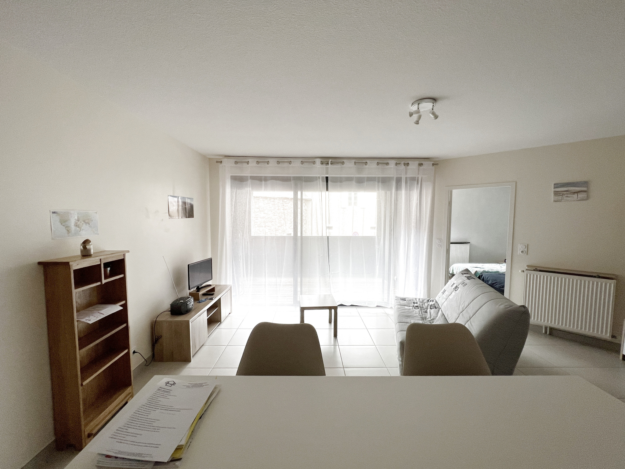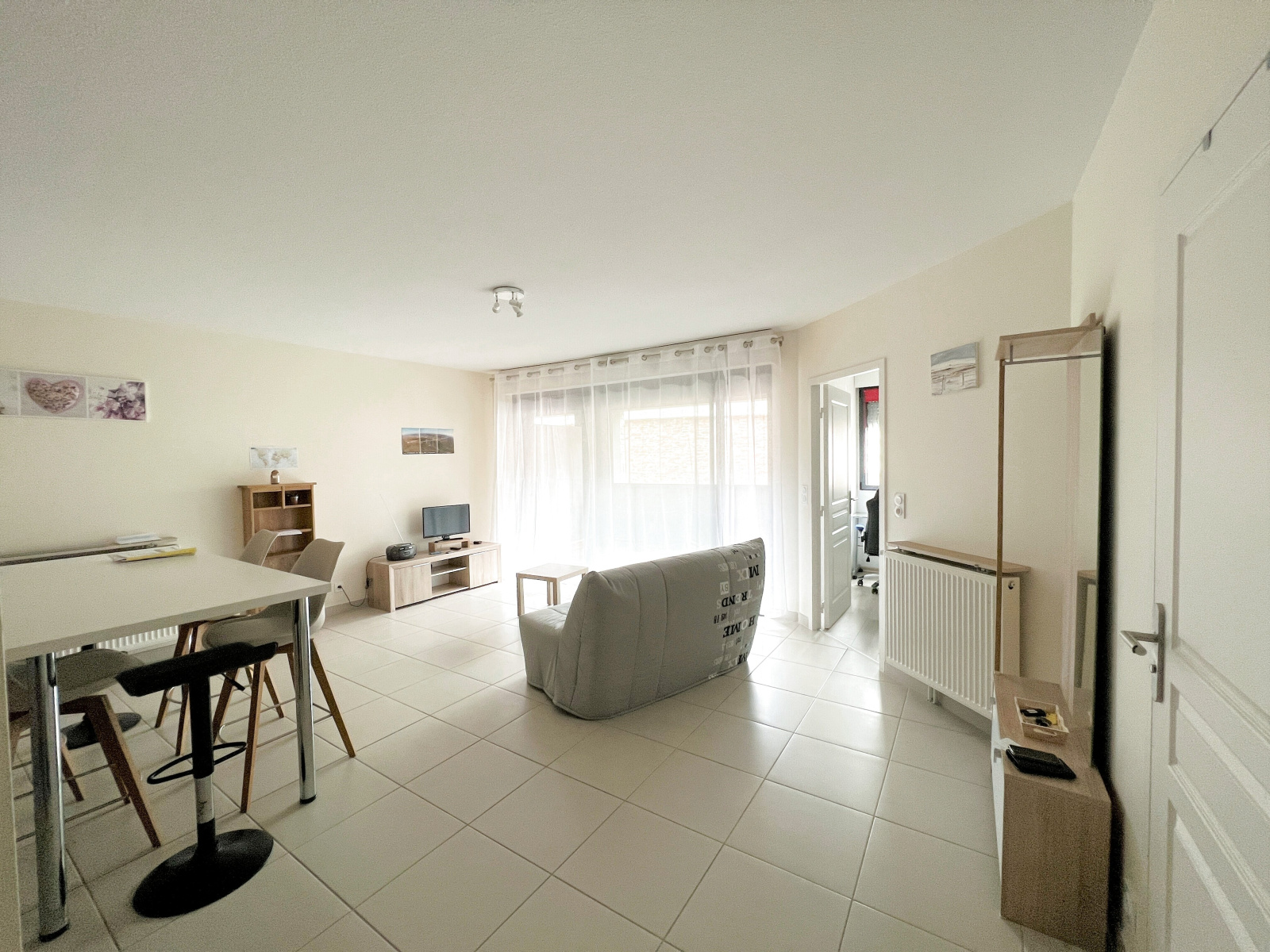 Il se compose d'une entrée, d'un WC indépendant, d'une cuisine équipée (four, frigo, plaques, micro-ondes, placards....) ouverte sur un grand séjour, d'une chambre avec placard et d'une salle d'eau.