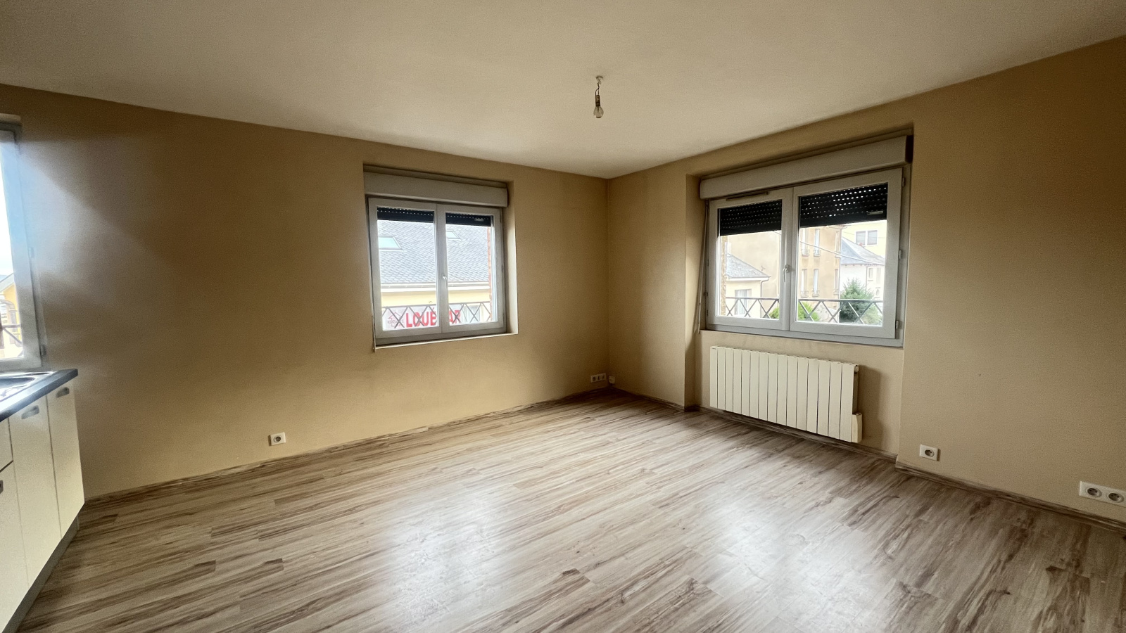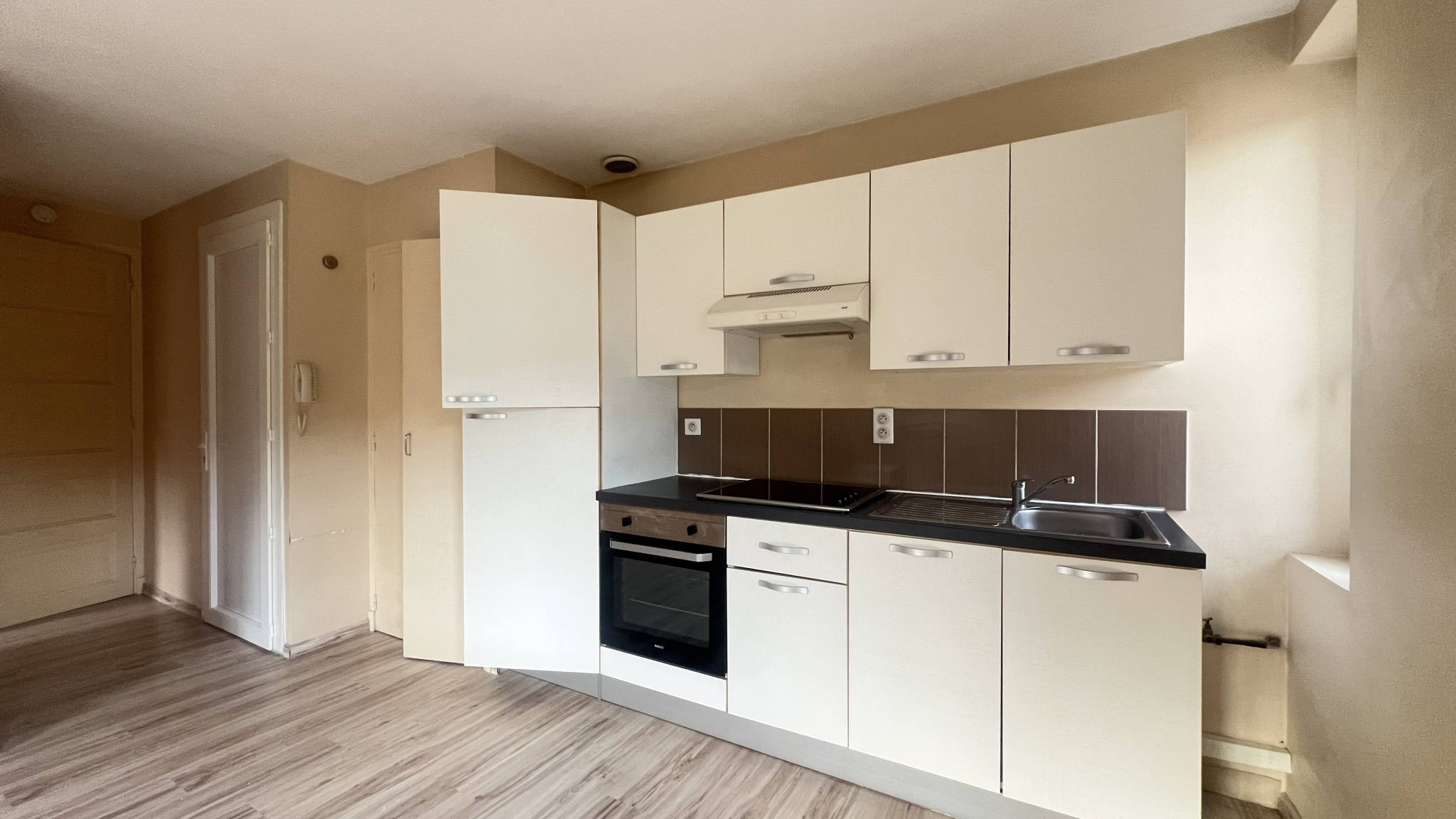 Une pièce de vie lumineuse avec cuisine entièrement refaite à neuf, équipée d’un réfrigérateur, d’une plaque de cuisson, d’un four et de nombreux rangements ;