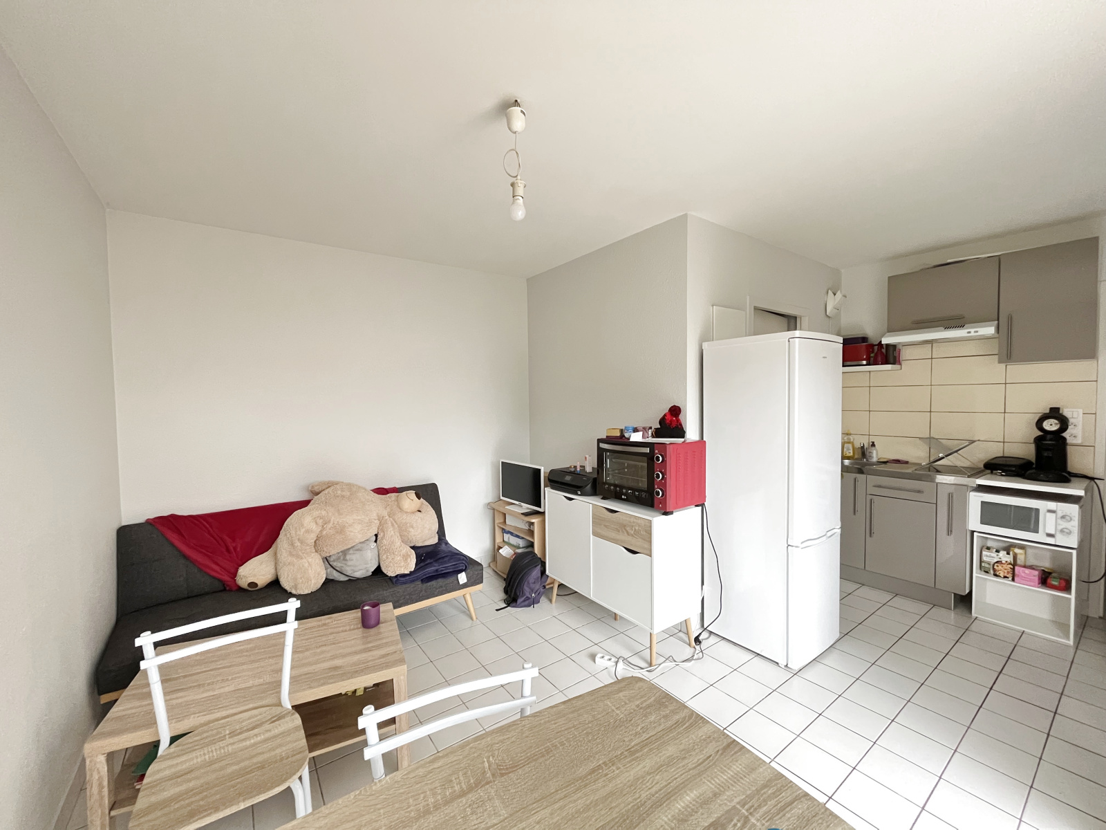 Cet appartement en rez de chaussée d'une petite copropriété, se compose : d'une entrée, d'un séjour donnant sur terrasse de 4.48 m² avec un coin kitchenette (plaque vitro + frigo, hotte et placards). Il comprend également une chambre avec placard ainsi qu'une salle d'eau / WC.