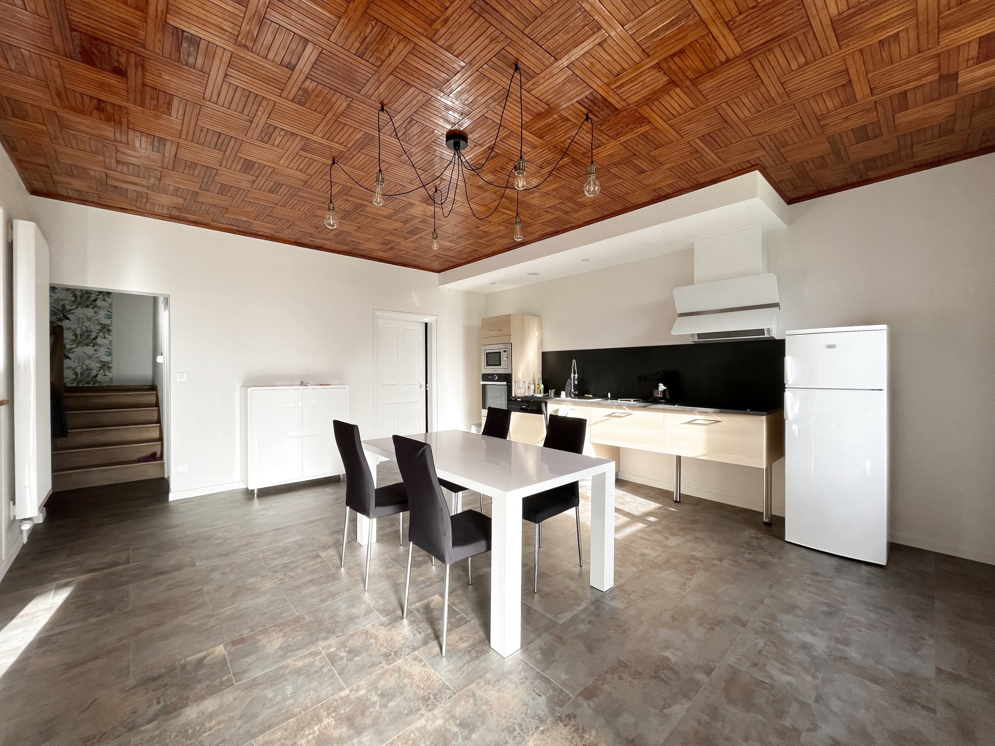 L'espace de vie au rez-de-chaussée se compose d'un séjour spacieux et lumineux qui s'ouvre sur une cuisine équipée moderne et fonctionnelle avec placards de rangement, un four, un lave-vaisselle, un micro-ondes, une plaque vitrocéramique et une hotte aspirante. Un coin cellier pratique avec une machine à laver est également à votre disposition.