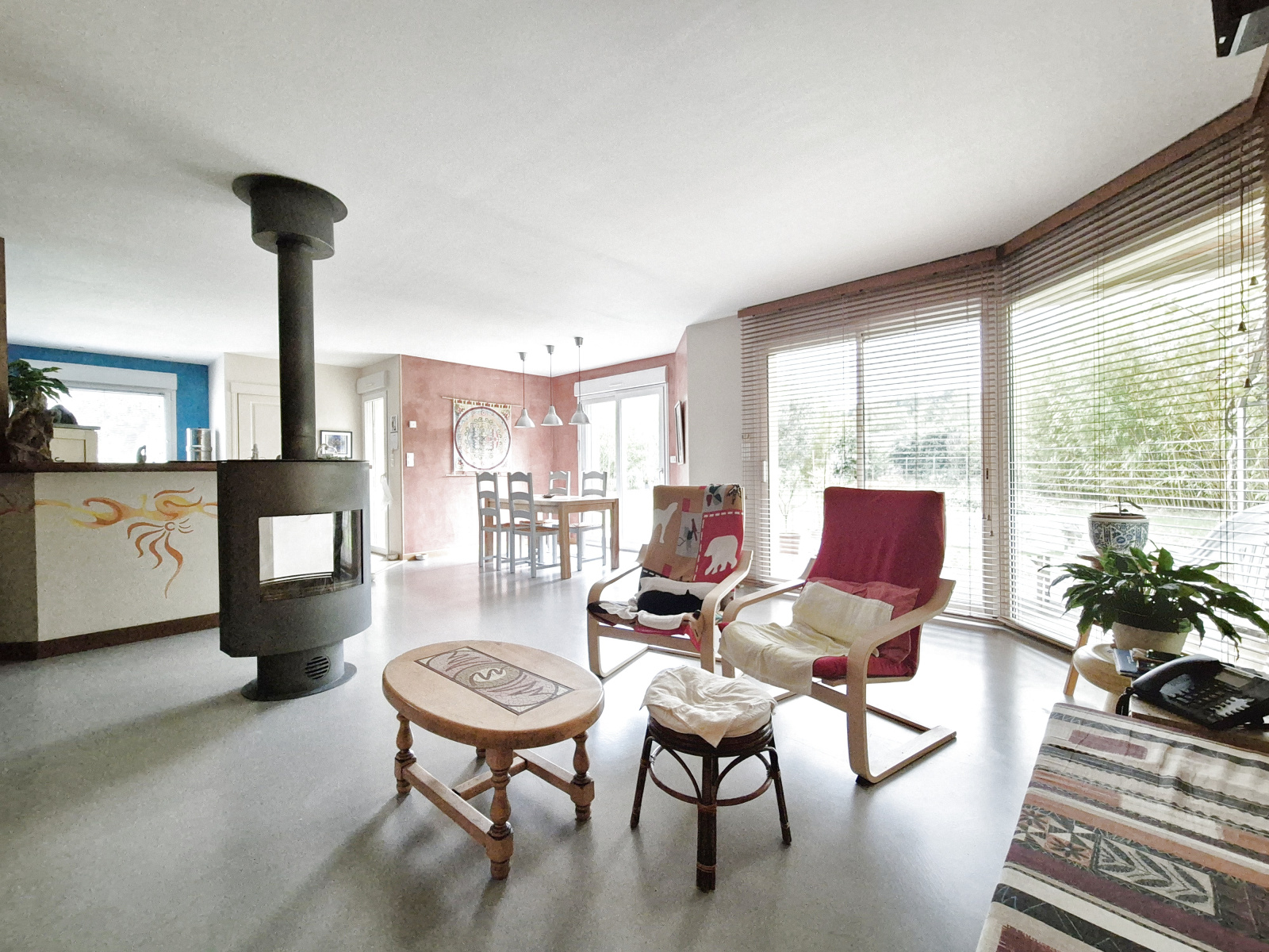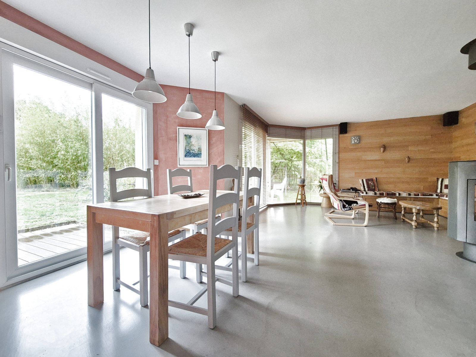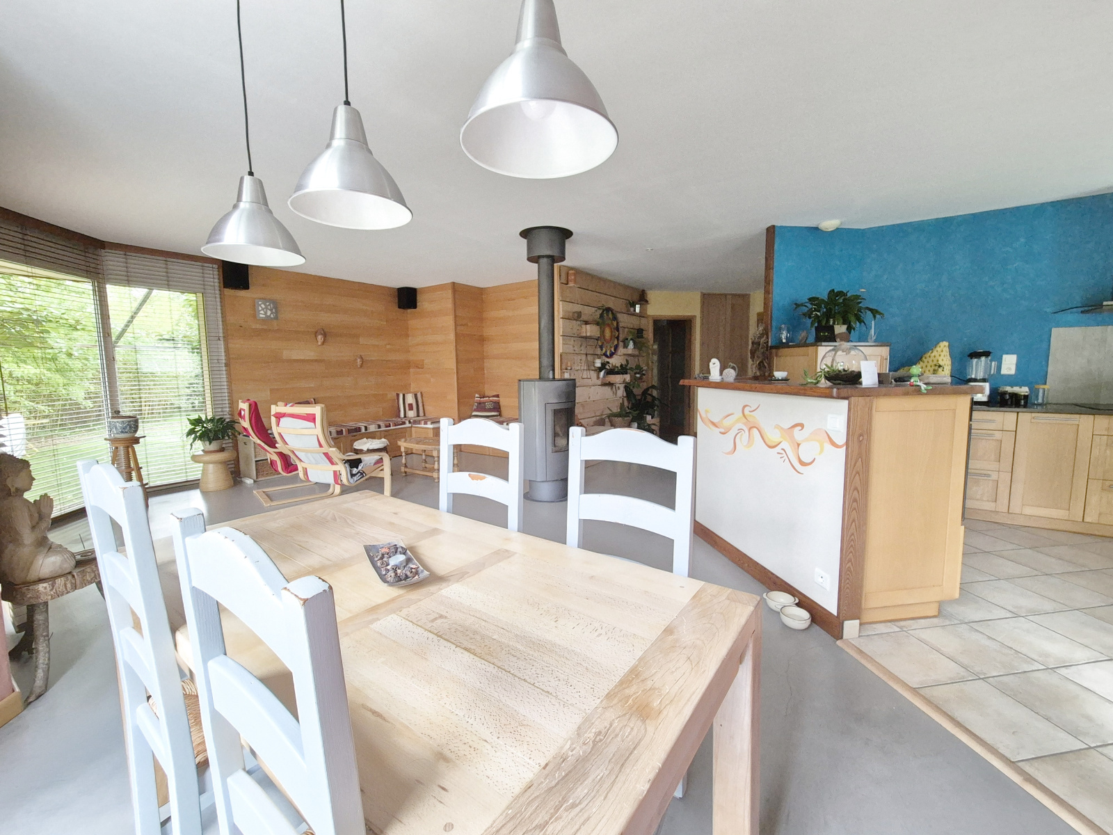 L'espace de vie, lumineux et chaleureux, s'ouvre sur une cuisine entièrement ouverte et un séjour agrémenté d'un pôele bois. L'ensemble donne directement accès à une grande terrasse idéale pour vos moments de détente, et à un jardin soigneusement entretenu, verdoyant et sans vis à vis.