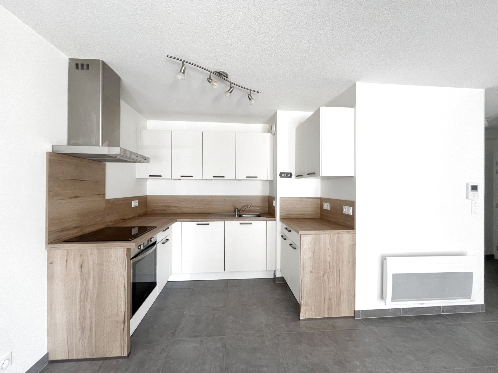Il se compose d’une entrée ouvrant sur une spacieuse et lumineuse pièce de vie, avec cuisine équipée.